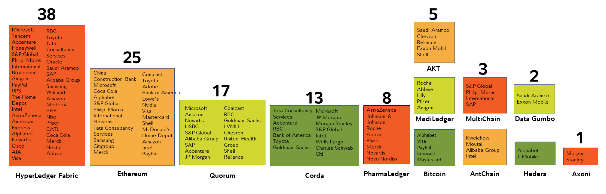 Figure 1: According to Blockdata, Year-over-year (YoY) growth for the three most popular blockchains used by the world’s largest companies: HyperLedger +12%, Ethereum +6%, Quorum +6%. | Source: Blockdata