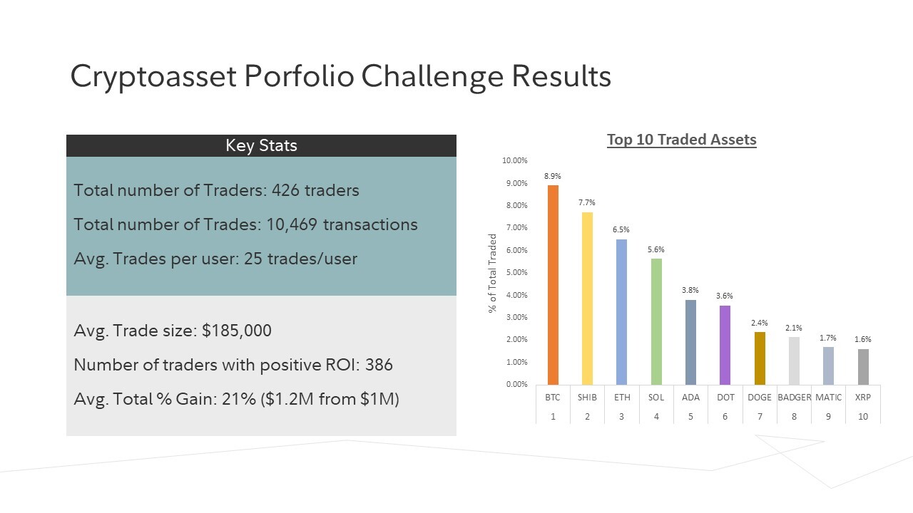 This year’s challenge also introduced a new feature: Sherlock™. Sherlock is a data and analytics research service for institutional crypto investors developed by FCAT. Access to Sherlock helped Challenge investors access current information on the assets in which they were most interested. Sherlock overcomes the fragmented market for crypto information by providing many relevant data categories within a single, easy to use application.