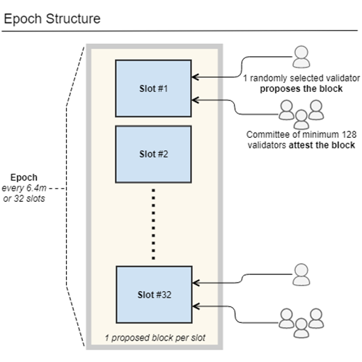The basic structure of the blockchain is as follows—blocks filled with transactions are appended to the Ethereum blockchain every 12 seconds. Blocks are organized within a slot and are part of epochs that span every 6.4 minutes or 32 slots. In terms of responsibilities, validators are compensated every epoch for performing primarily two main duties—block proposals and attestations.
