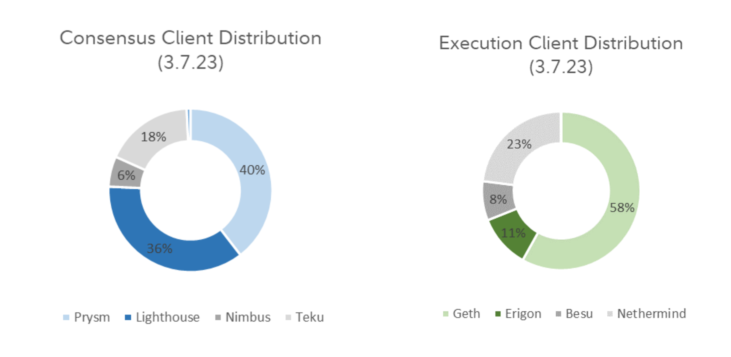 The above visuals show the estimated distribution of (a) consensus clients and (b) execution clients at the time of writing. Client diversity for consensus clients is healthier with 40% share for the leading client compared to execution clients where Geth holds over 55% share.3 Overall, client diversity is expected to play a key role in network security and warrants close monitoring by validators.