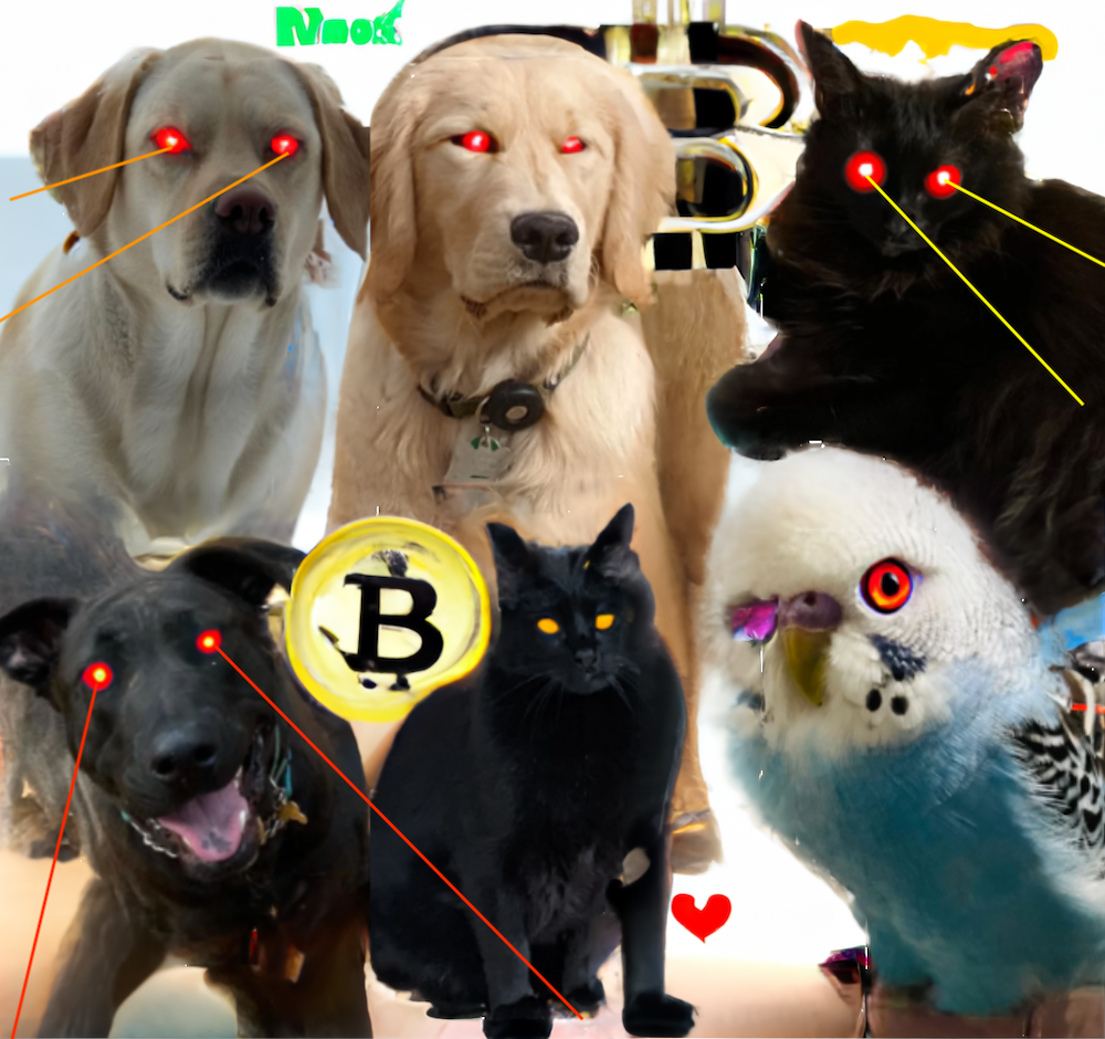 In April of 2023, Fidelity Center for Applied Technology’s (FCAT) Mining Team created its first experimental Bitcoin inscription with the assistance of an AI image generator. This ordinal, a Bitcoin-themed collage featuring the team’s furry friends, was assigned a unique number that marked its permanence on the Bitcoin blockchain. The image to the right is the original image used to generate the inscription.